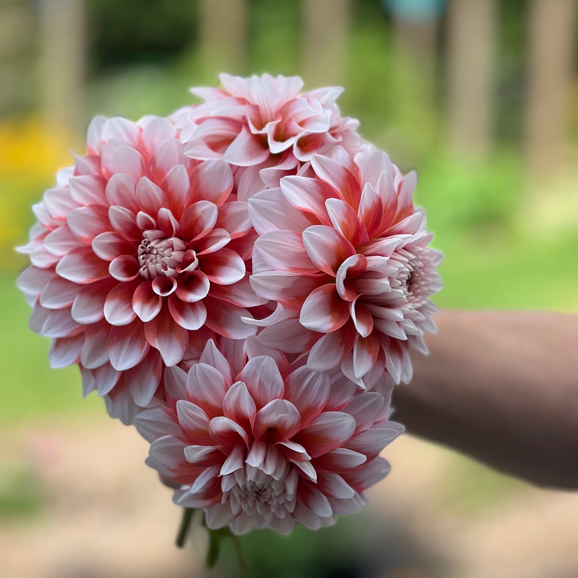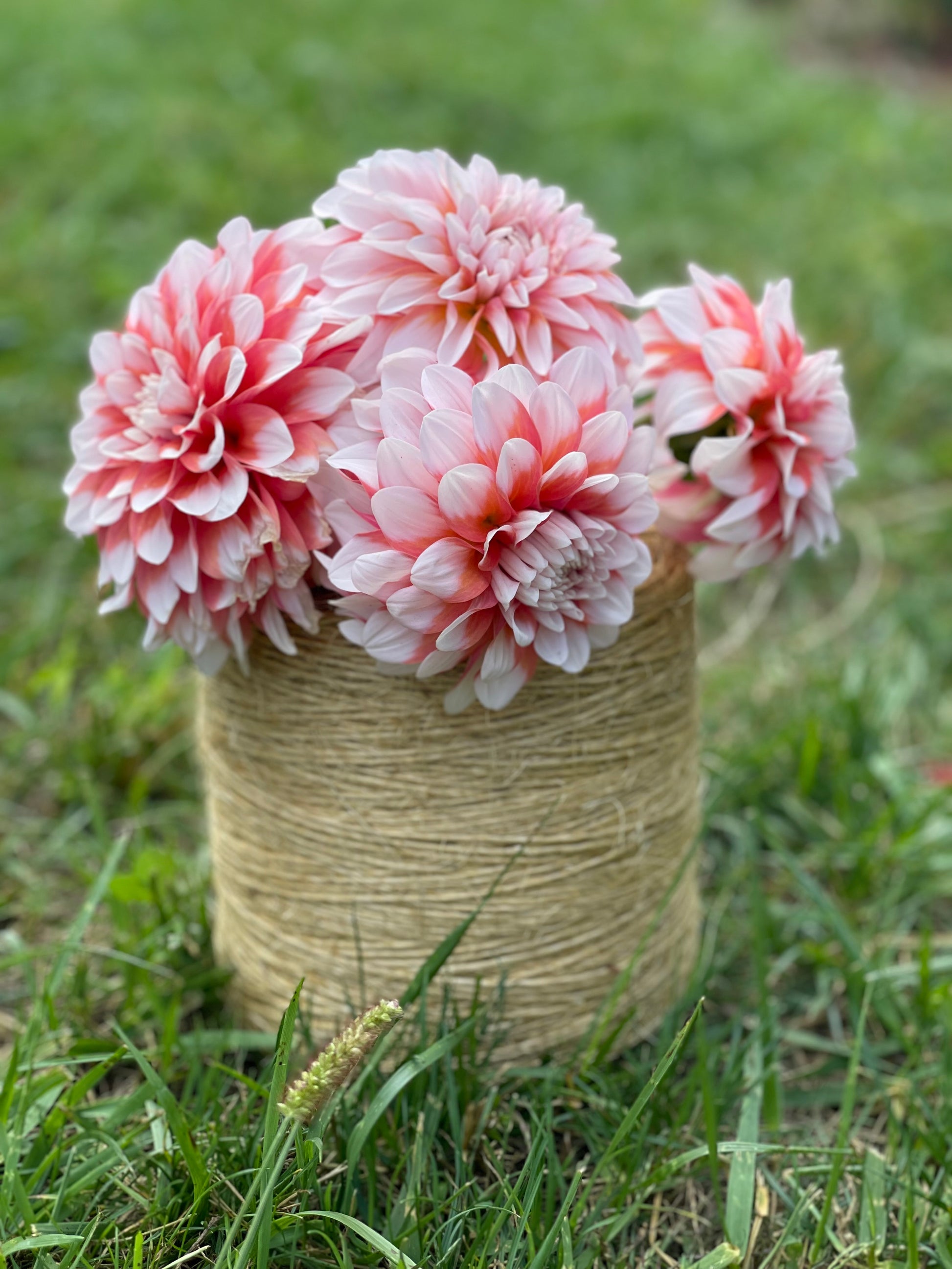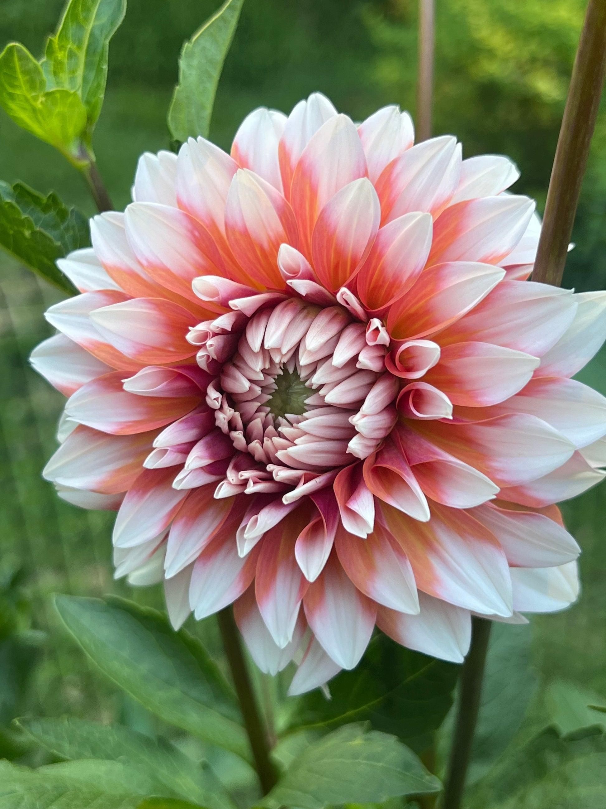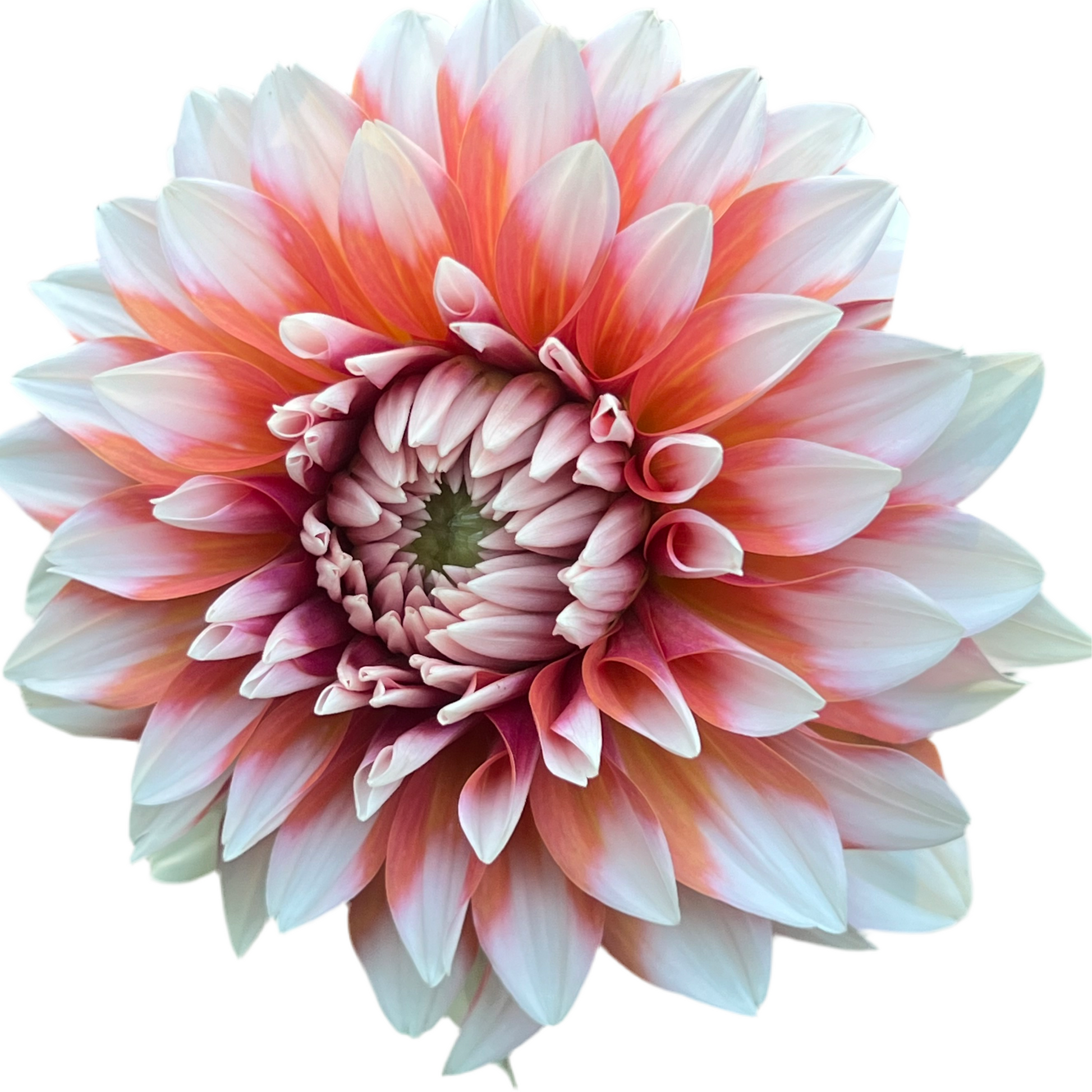 À La Mode is a striking variety known for its creamy white petals with soft orange tips, creating a stunning bicolor effect on blooms between 4-6" in diameter. It belongs to the Formal Decorative dahlia category, meaning its petals are symmetrically arranged with a smooth, full appearance. This dahlia keeps pumping out the blooms all season long and is a great compliment to fall bouquets. Plant grows to 4' in our field.