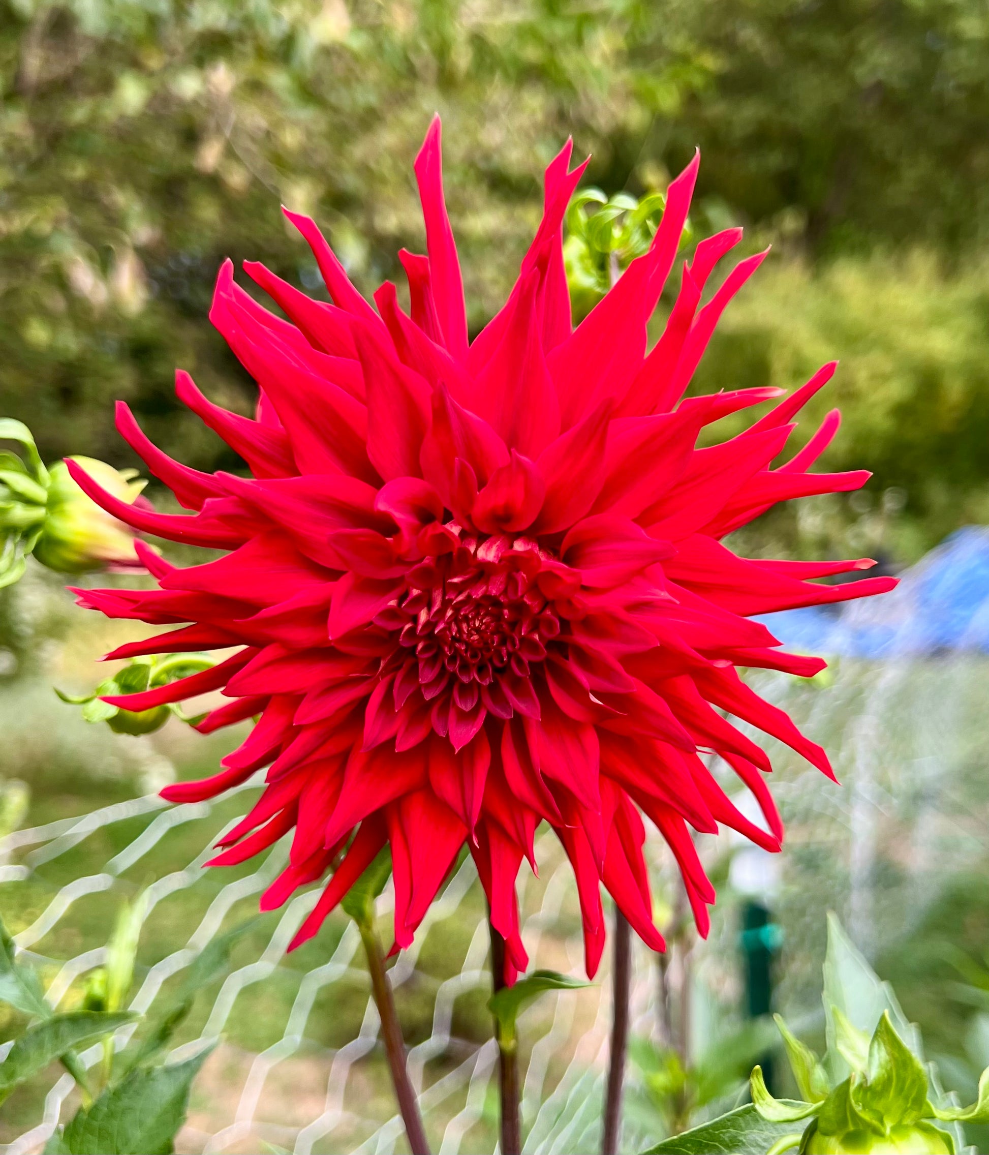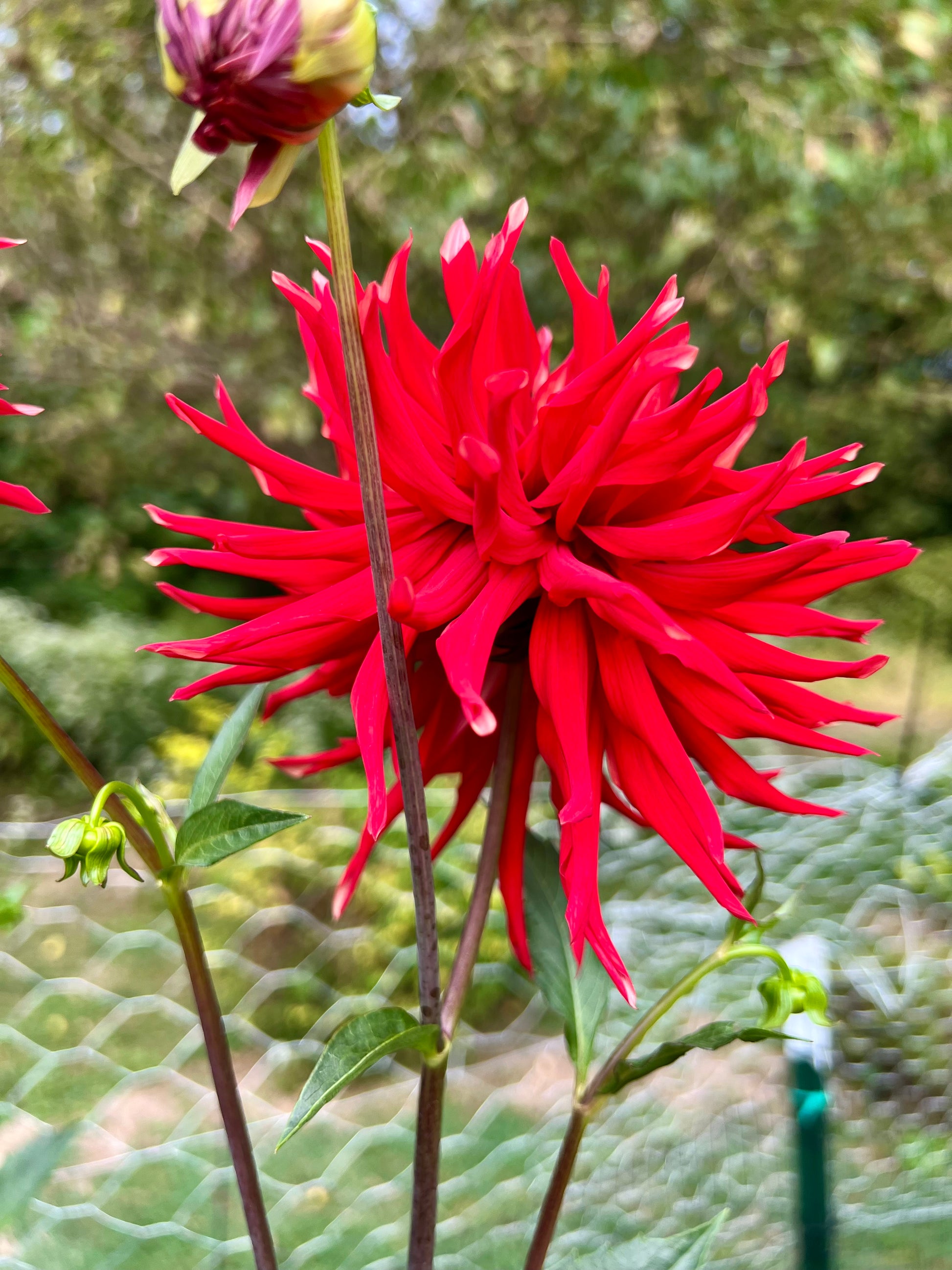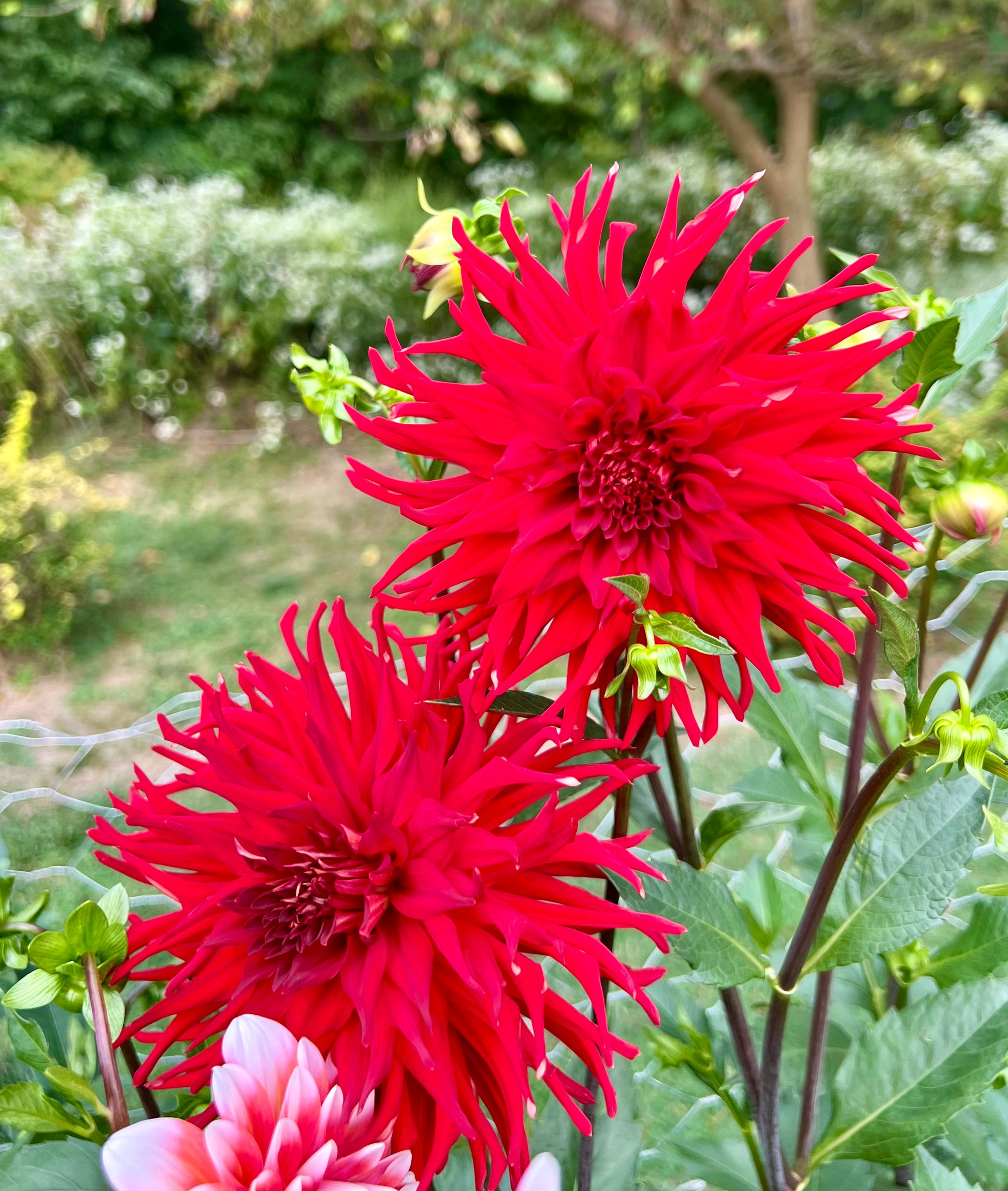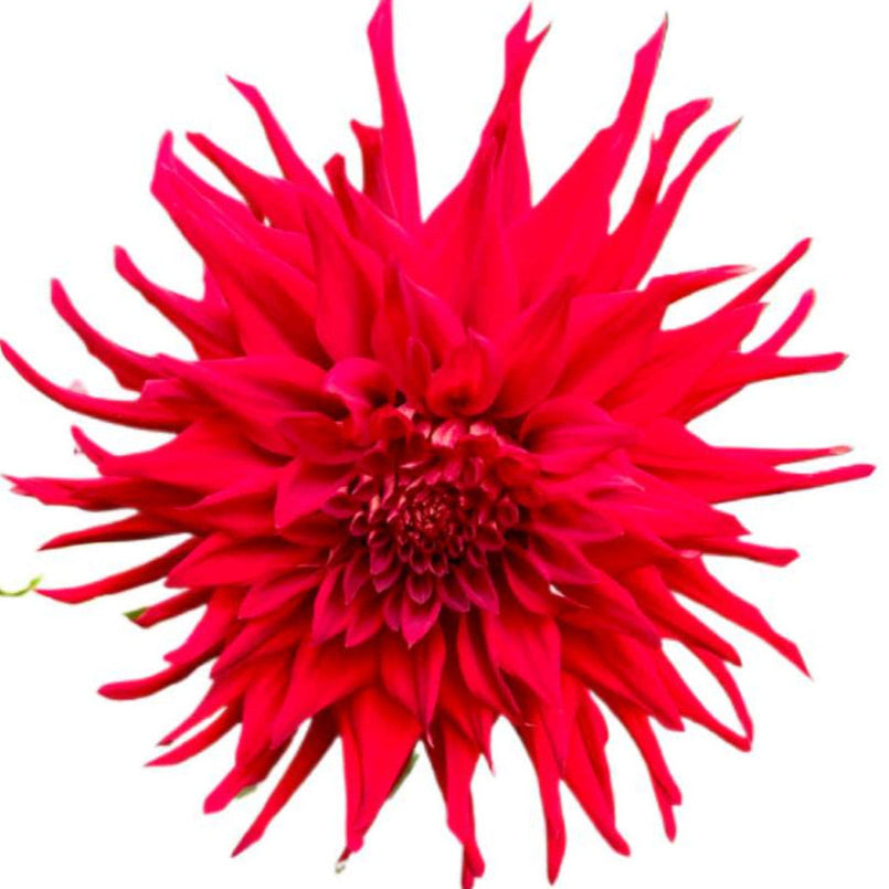 Vibrant red cactus-type blooms roughly 6" wide on very tall 5-6' plants. Such a striking display in the field and a show stopper in an arrangement, but even more as a single bloom in a narrow vase. Though the cactus form can be more fragile if the bloom has stayed on the plant too long before cutting, we find that it has a very long vase life and holds up to the heat.