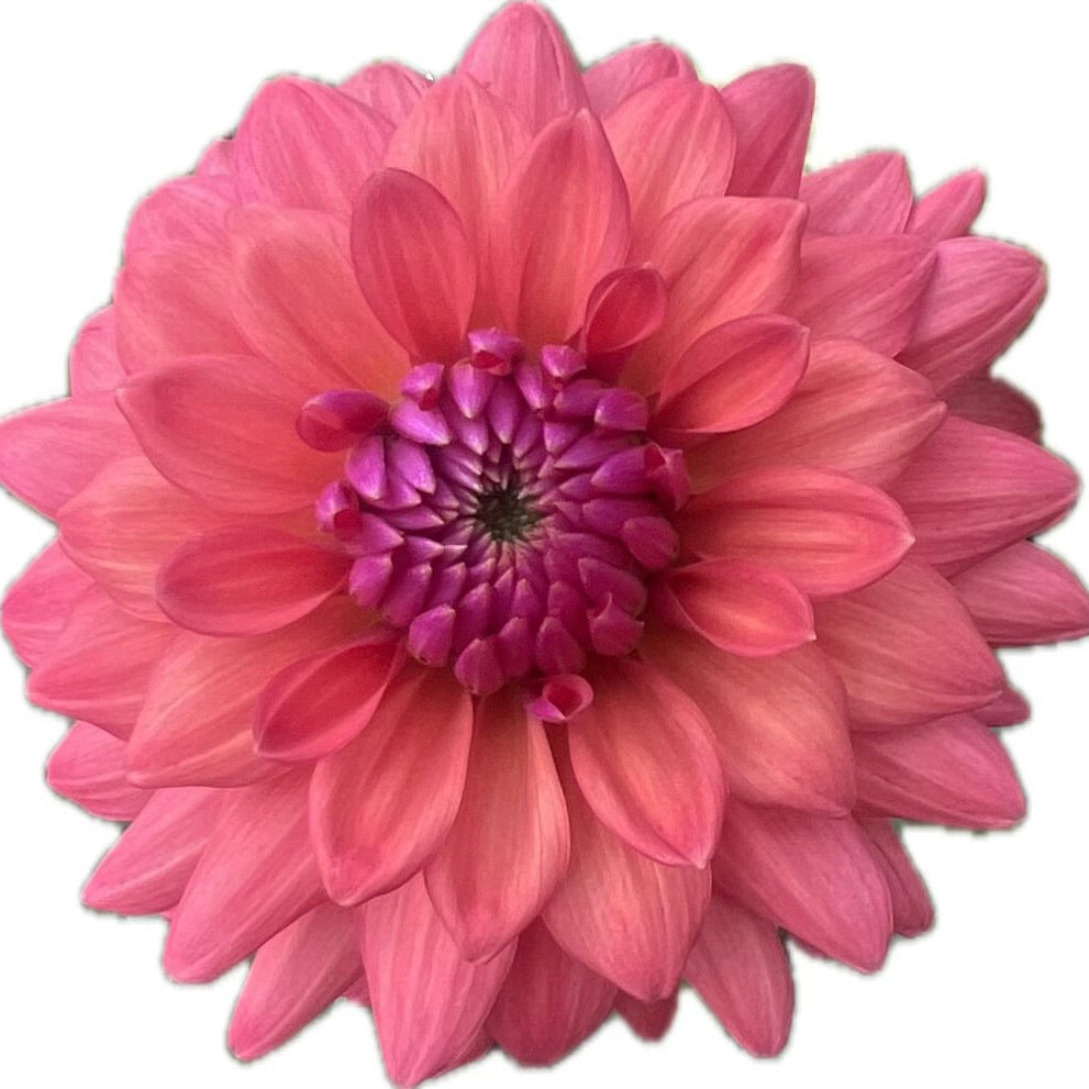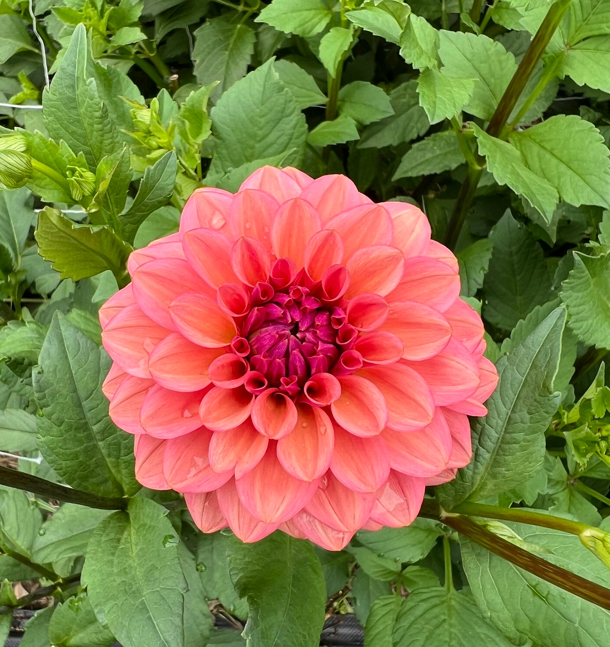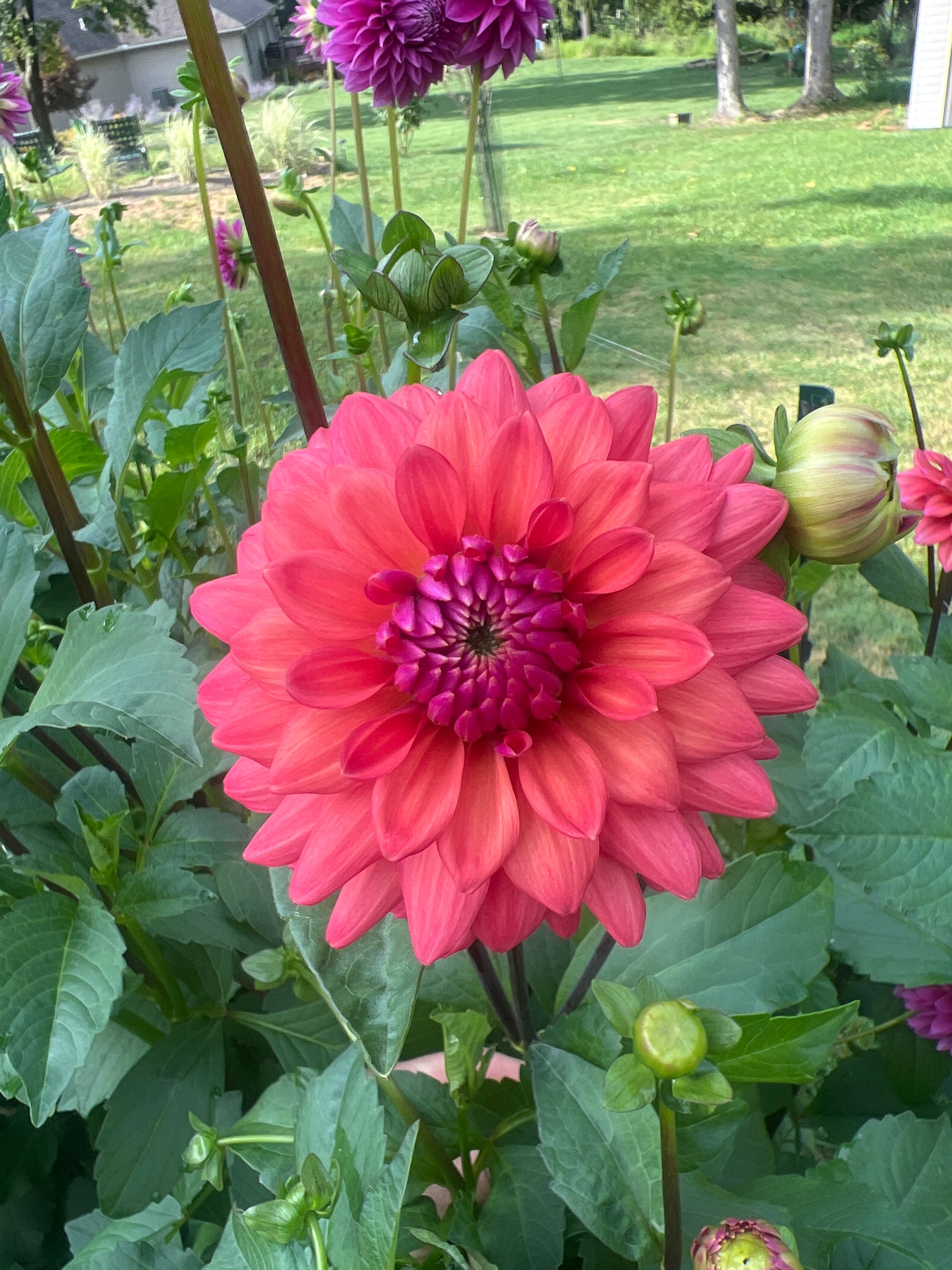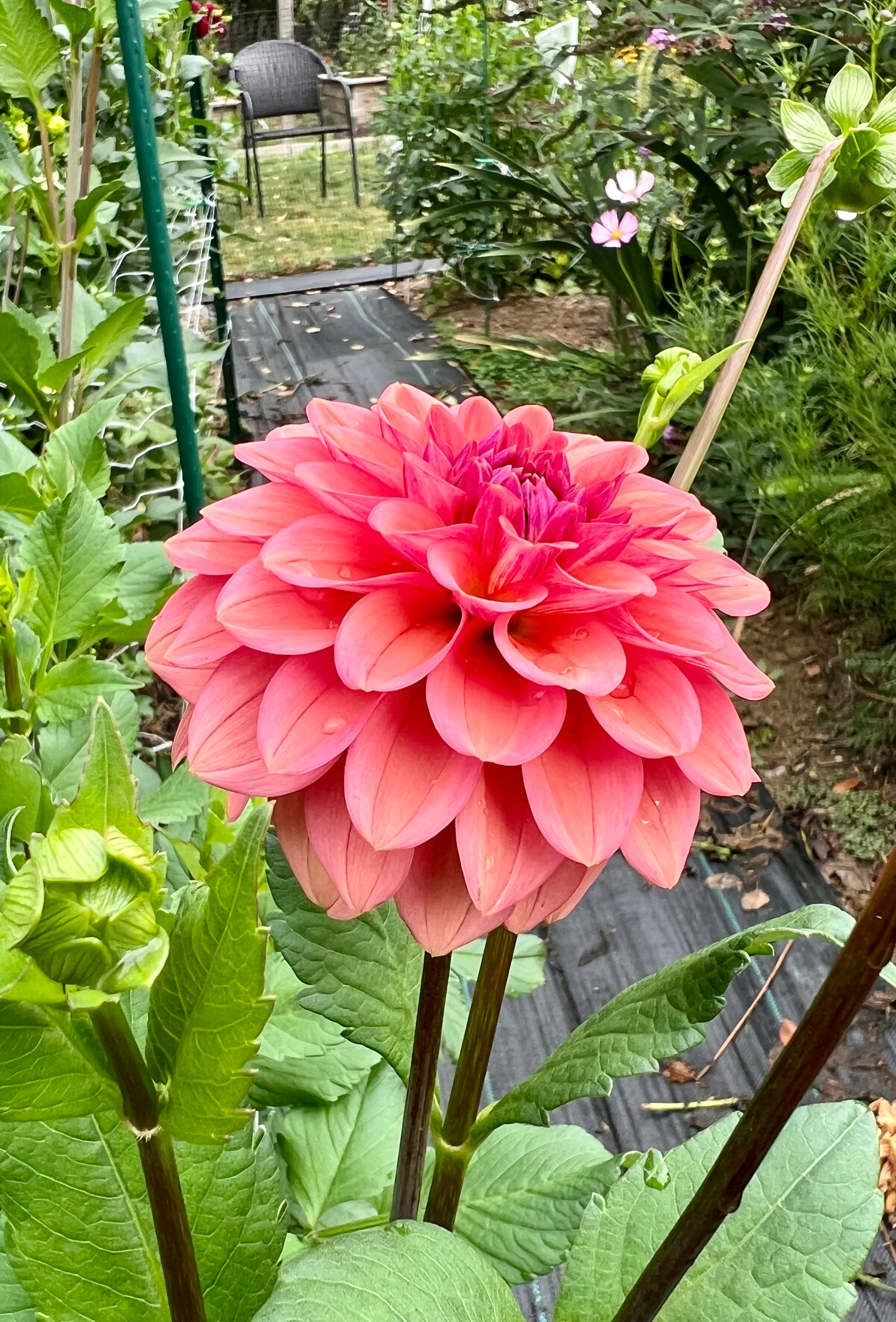 Cheers is one of our favorites from the original tubers acquired years ago. This fun 3" happy dahlia is a coral-watermelon color, but with a purple tinge in the center that hard to see in photographs. It is a strong 5' tall plant and pumps out blooms all season long on dark stems.