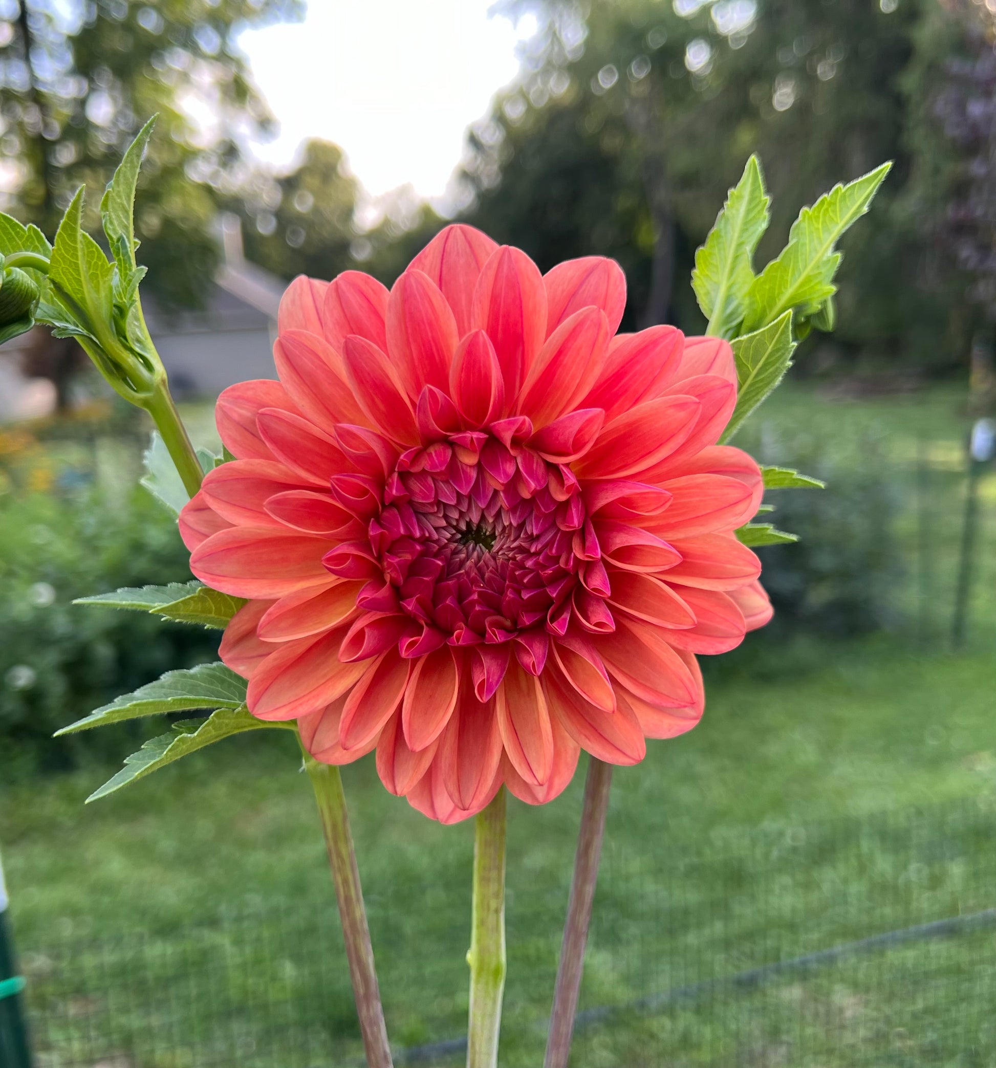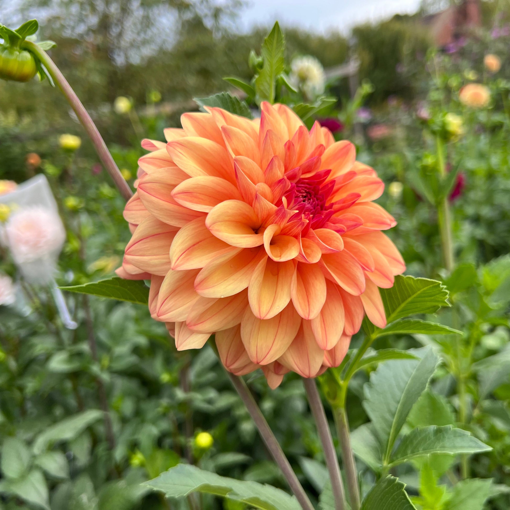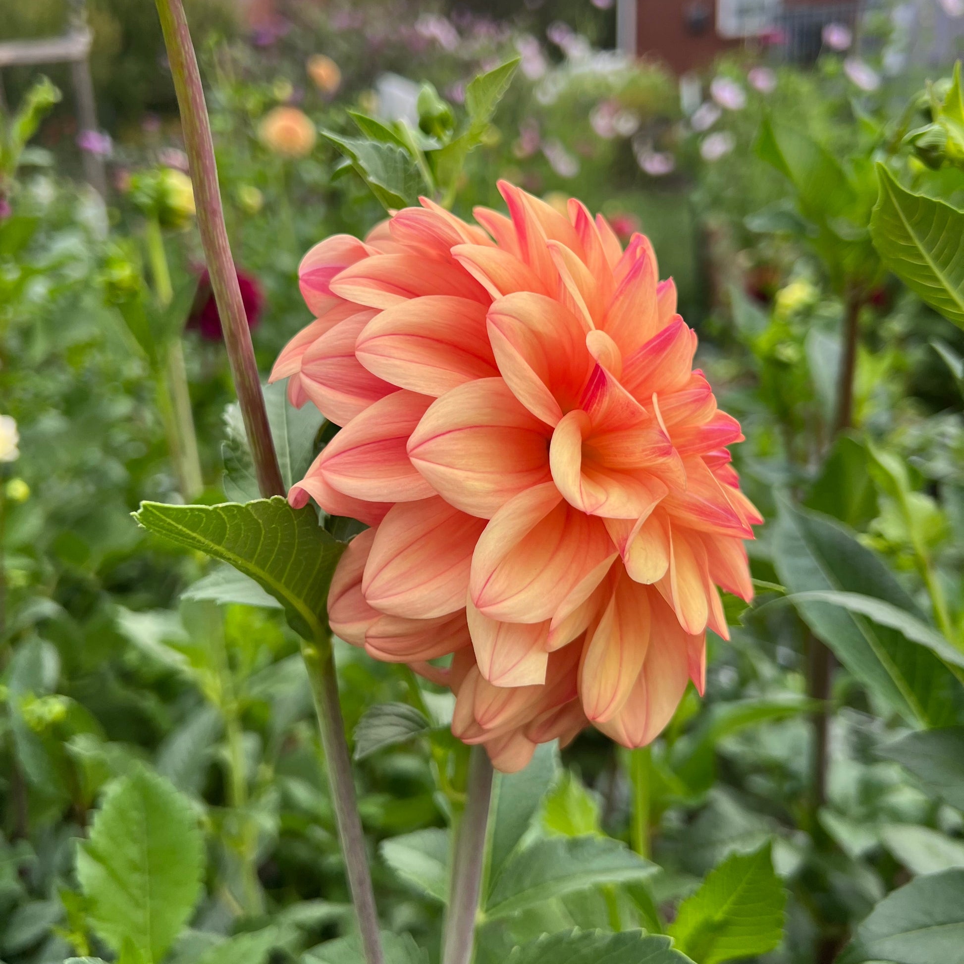 Big 5" orangey-peach dahlia that fades to a copper color if allowed to remain on the plant long enough. Most impressive if allow it to fully open before cutting. Plant height averages 4-5'.
