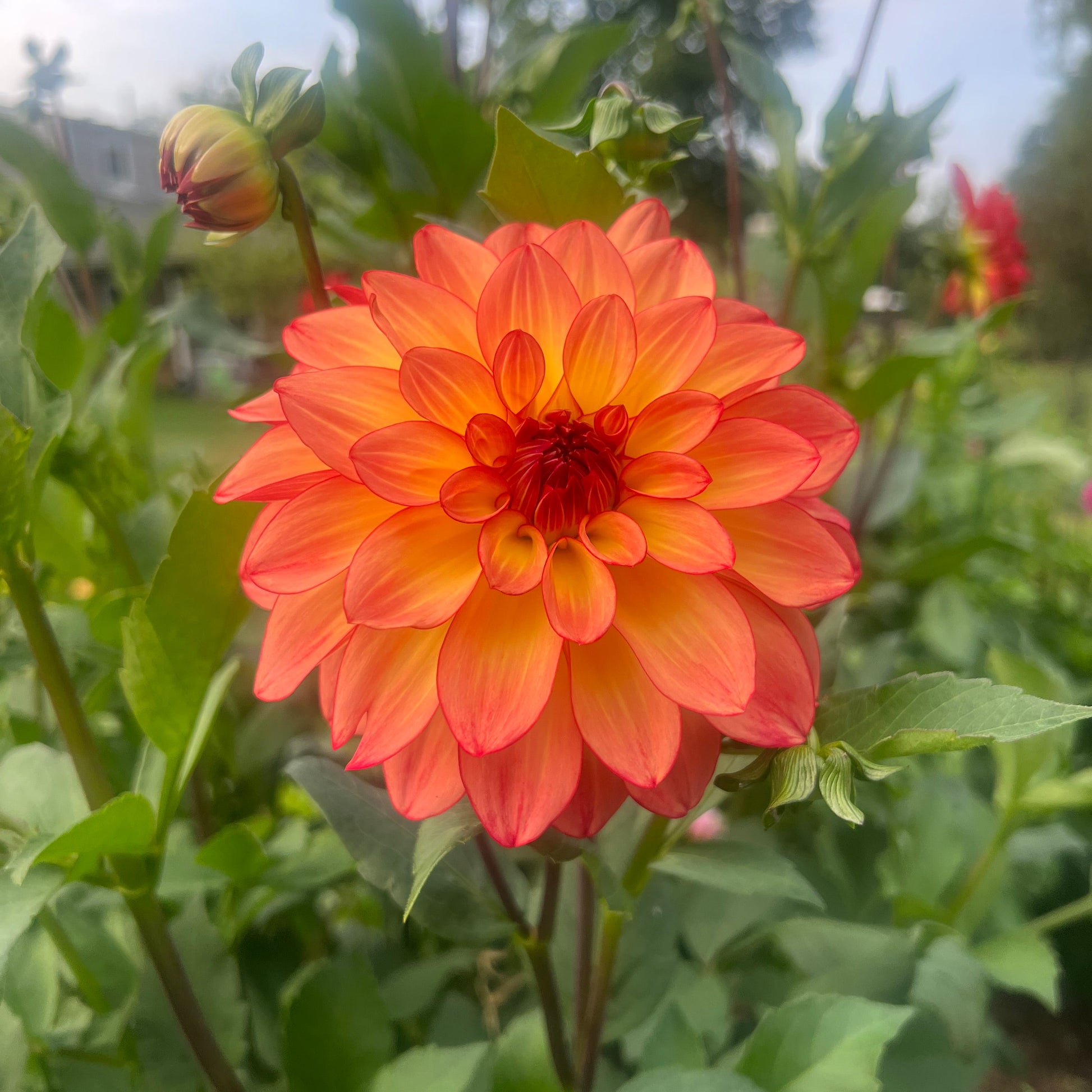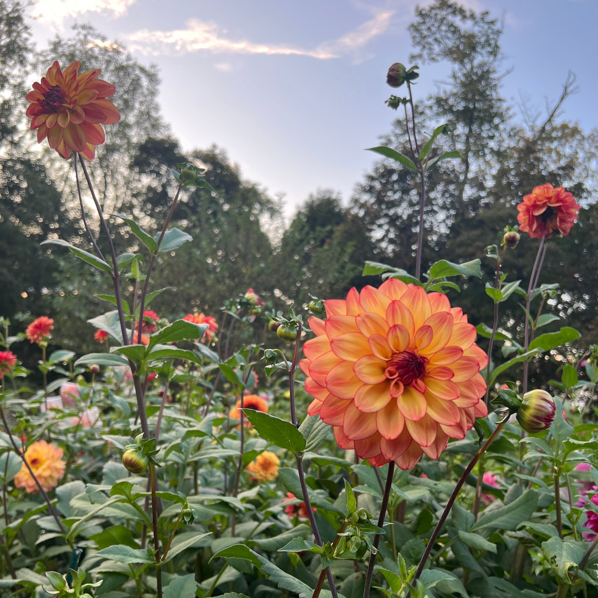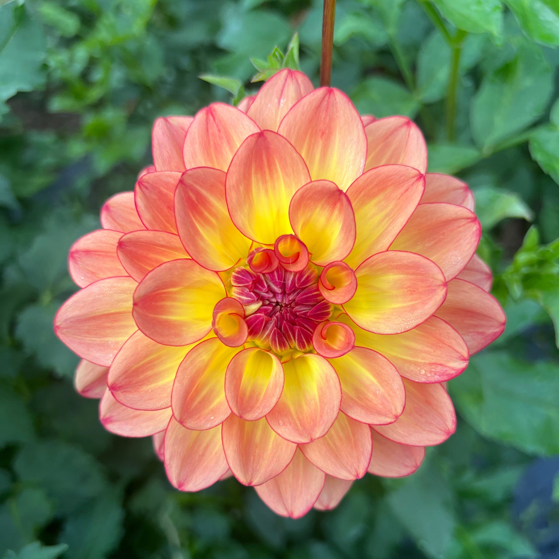 Mai Tai is an amazing bloom like a long sip of a tropical drink with shades of orange, bronze and yellows with edges of red. The plant is 5’ with darker stems and rich green foliage. It's a showstopper!