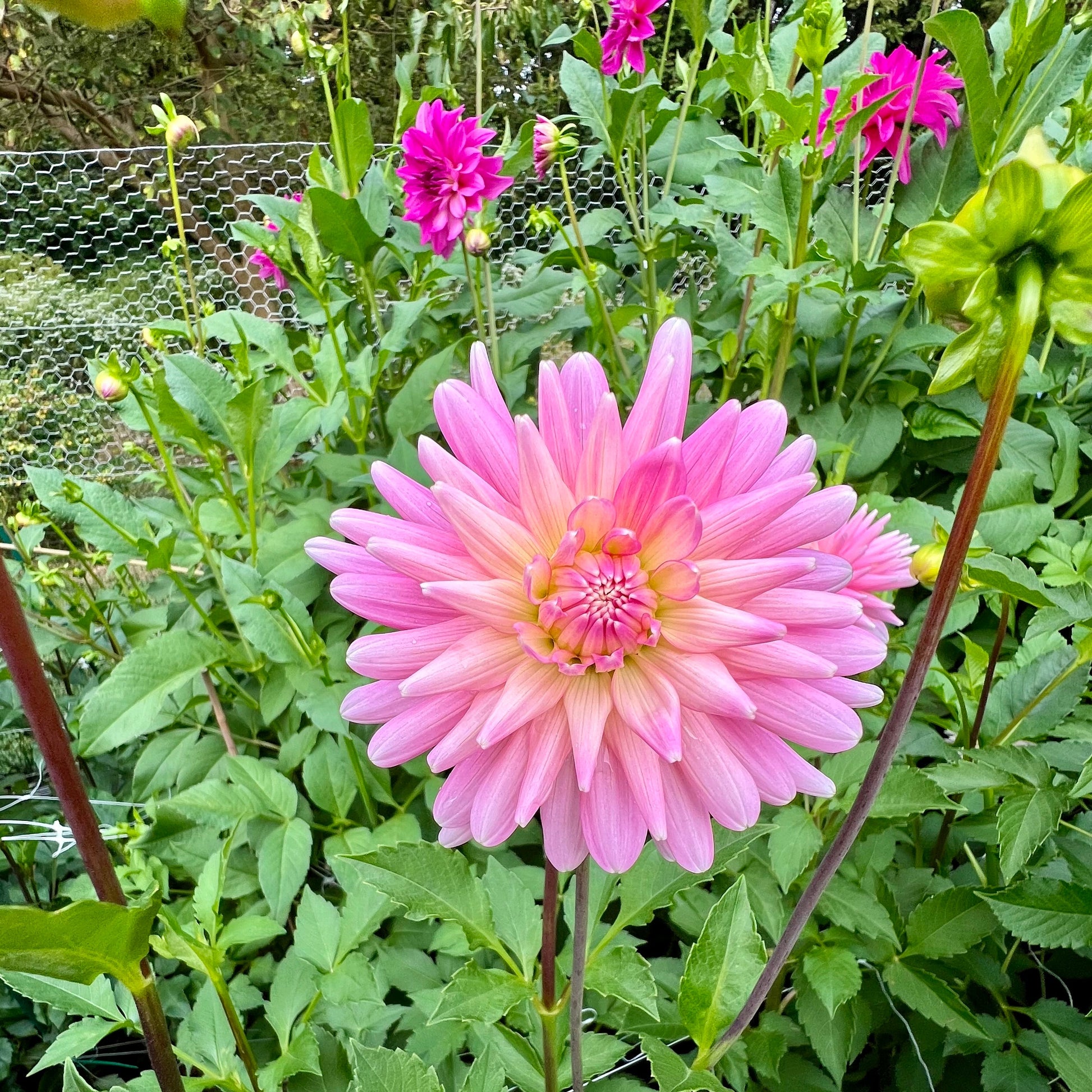 We always think of Miss Rose Fletcher as the sweetheart of our dahlia field. With her perky pale to dark pink semi-cactus blooms she blends with so many different varieties and is always a standout in an arrangement. Blooms run 4-6" in diameter and sit on strong 4' plants.