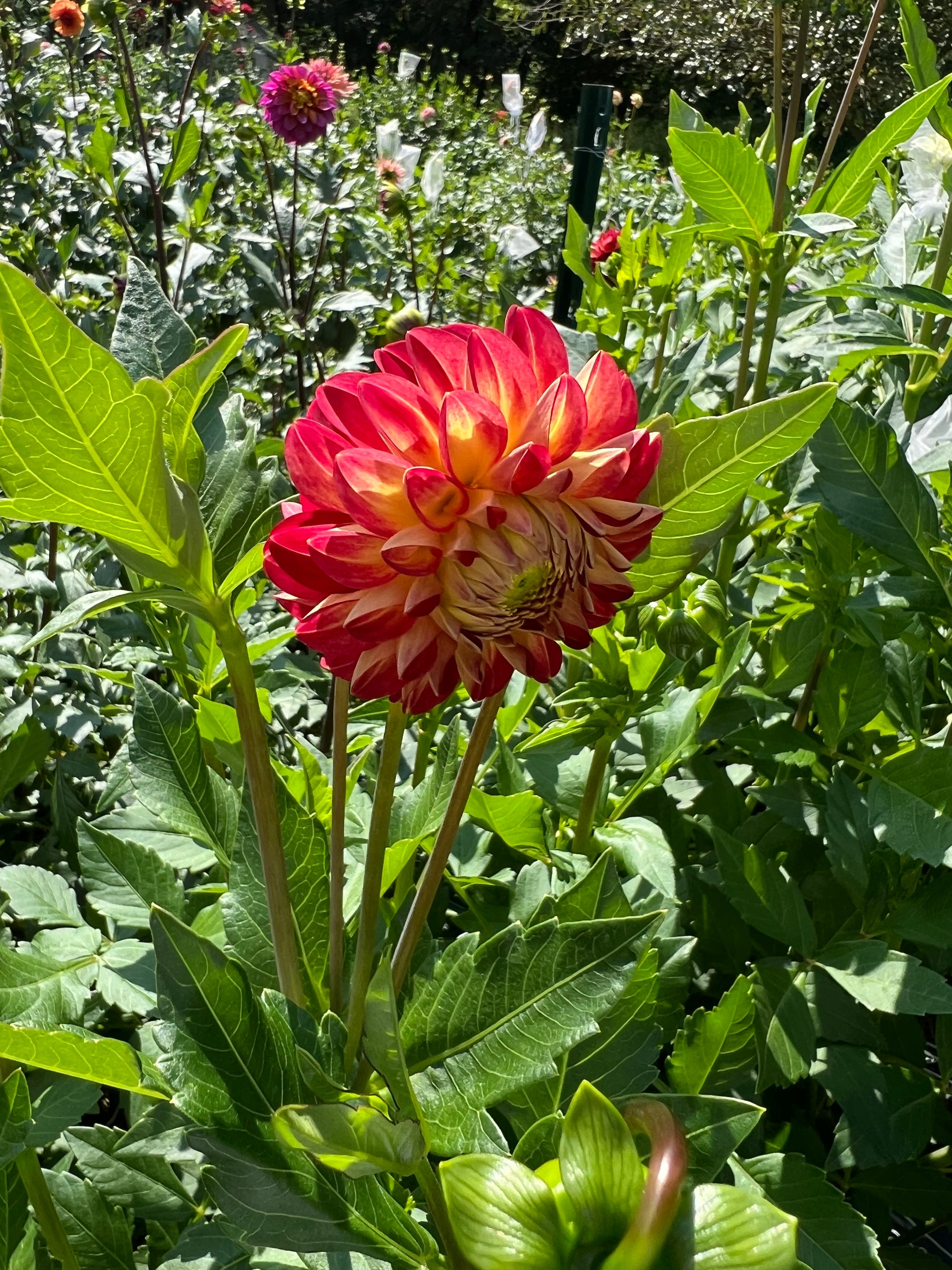 This formal decorative 3-4" bloom size is known for its flame look with a yellow-gold base and iridescent raspberry red highlights. It is so sturdy in arrangements with a very long vase life. A wonderful complement to just about any vibrant tone in your bouquets especially with fall arrangements. Gets 4-5' in our field.